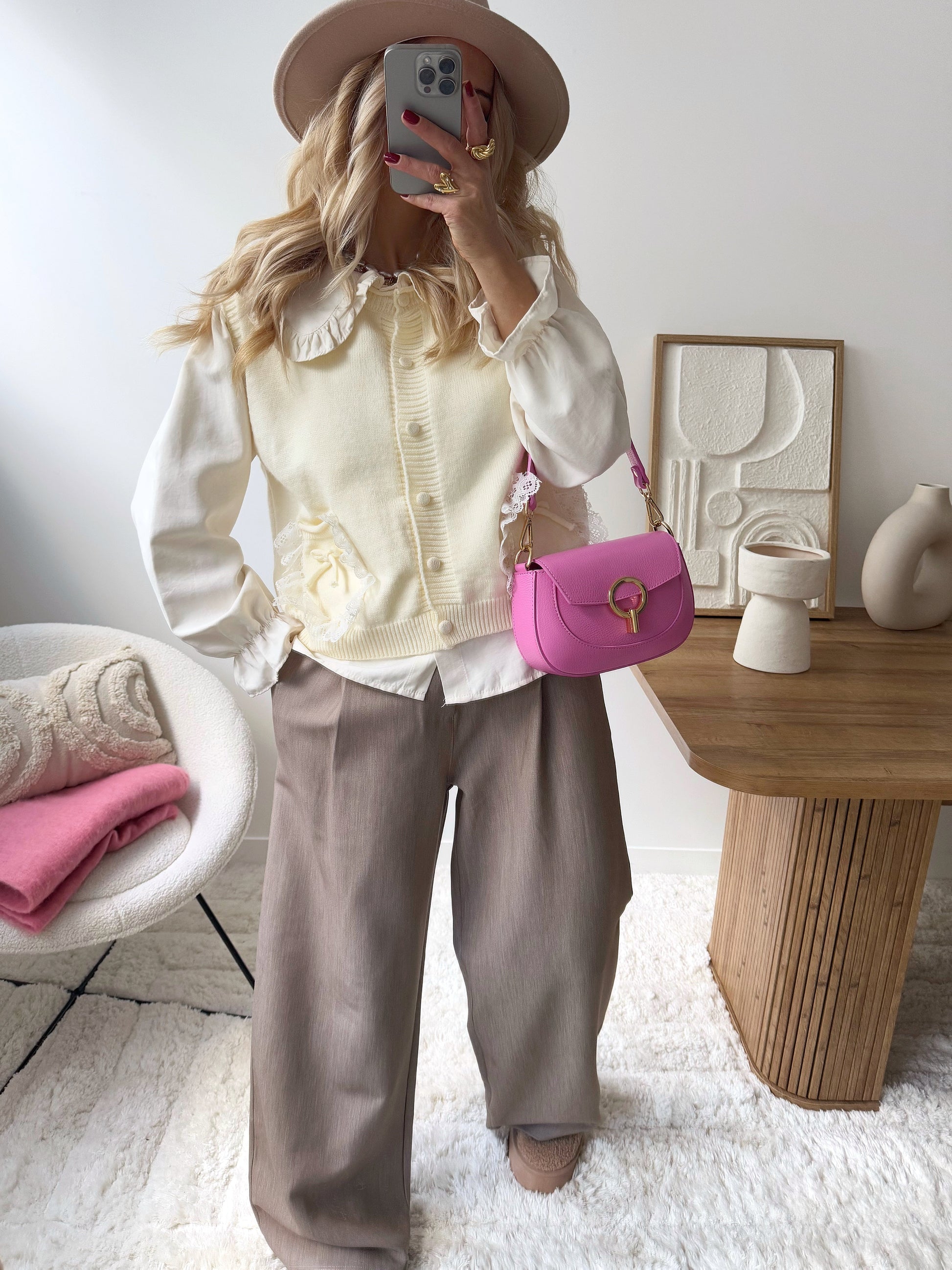 Combine elegance and comfort with the BETHEL dual-fabric knit sweater, a sophisticated piece for your wardrobe. The ruffled Peter Pan collar adds a delicate, feminine touch, while the ruffled elastic cuffs add a refined finish. The button placket allows for a practical and modern fit. The two patch pockets adorned with bows and lace add a lovely touch of style and texture, perfect for a chic yet classic look. Crafted from a soft and comfortable knit, this sweater is ideal for enhancing your casual outfits while remaining elegant.