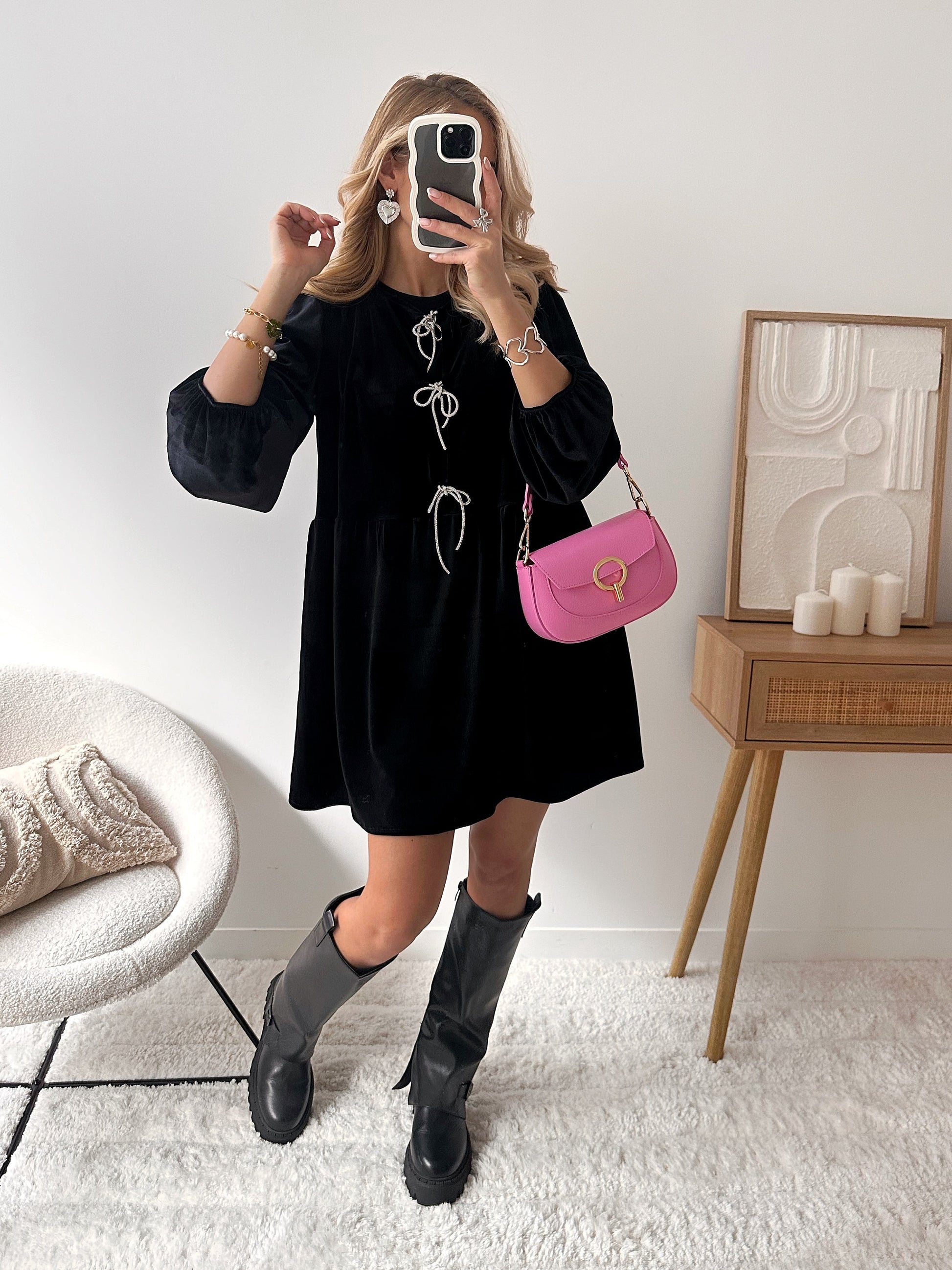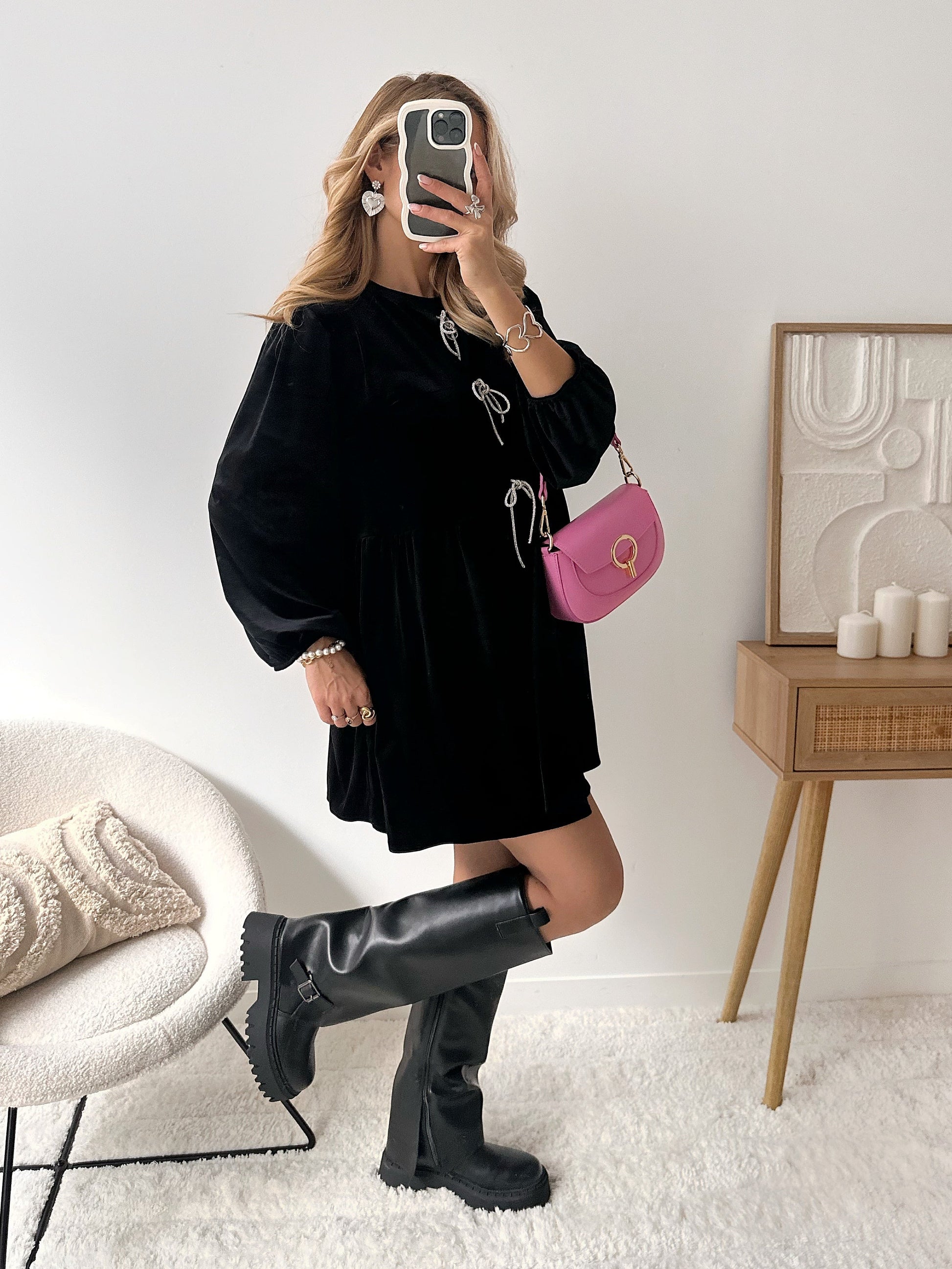 L'abito in velluto LOUISE incarna l'eleganza. La sua vestibilità ampia offre volume pur rimanendo ultra-chic. Il laccetto di strass sul davanti aggiunge un sottile tocco di glamour, mentre l'elastico sulle maniche aggiunge una finitura ordinata e leggermente voluminosa. Delicate arricciature in vita sottolineano la femminilità dell'abito e l'orlo svasato crea un grazioso movimento. Ideale per una serata fuori o un evento speciale, questo abito in velluto aggiungerà un tocco di lusso al tuo look. Indossalo con gli stivali per un look di tendenza o con i tacchi per un ensemble più raffinato ed elegante.