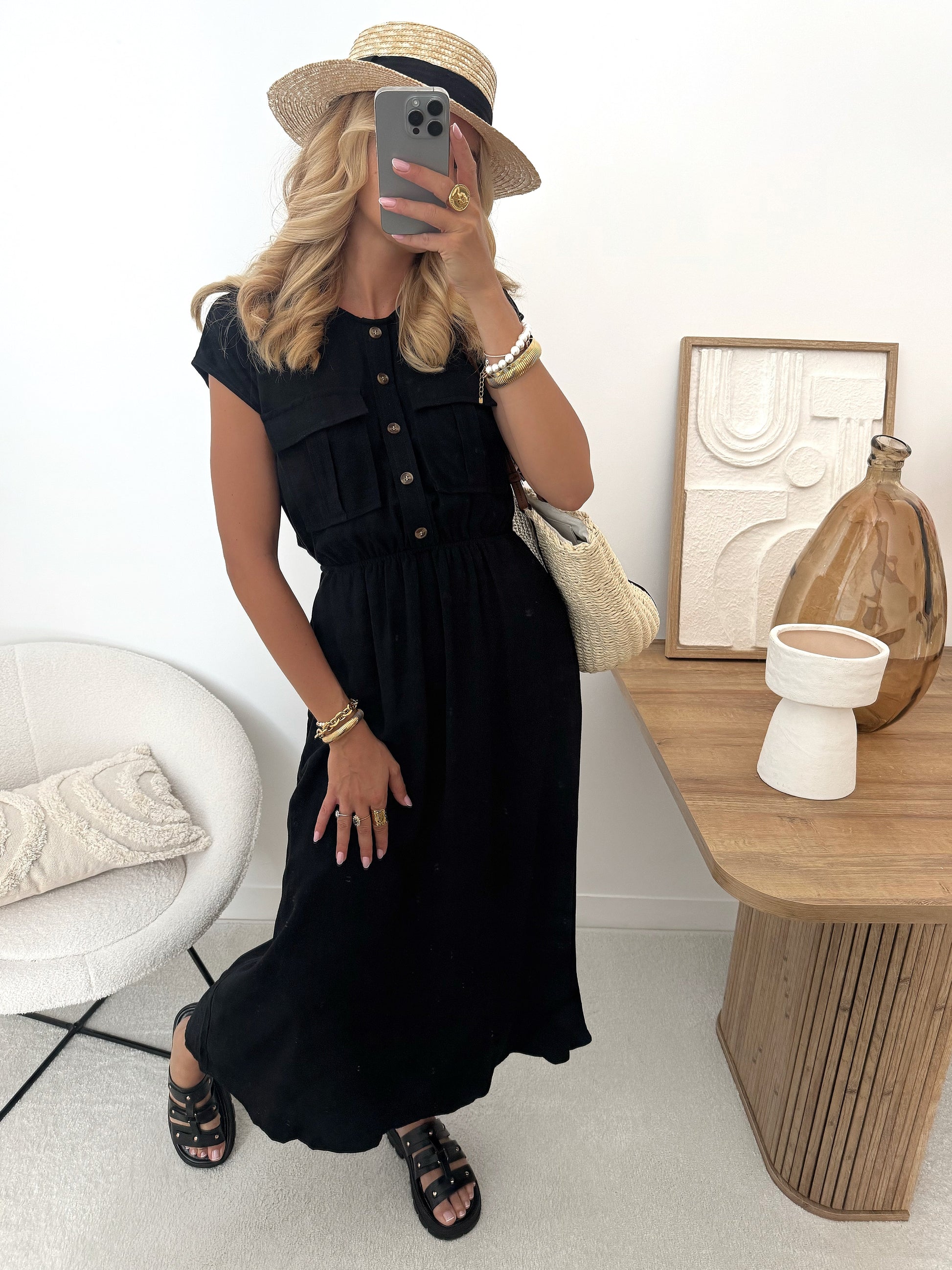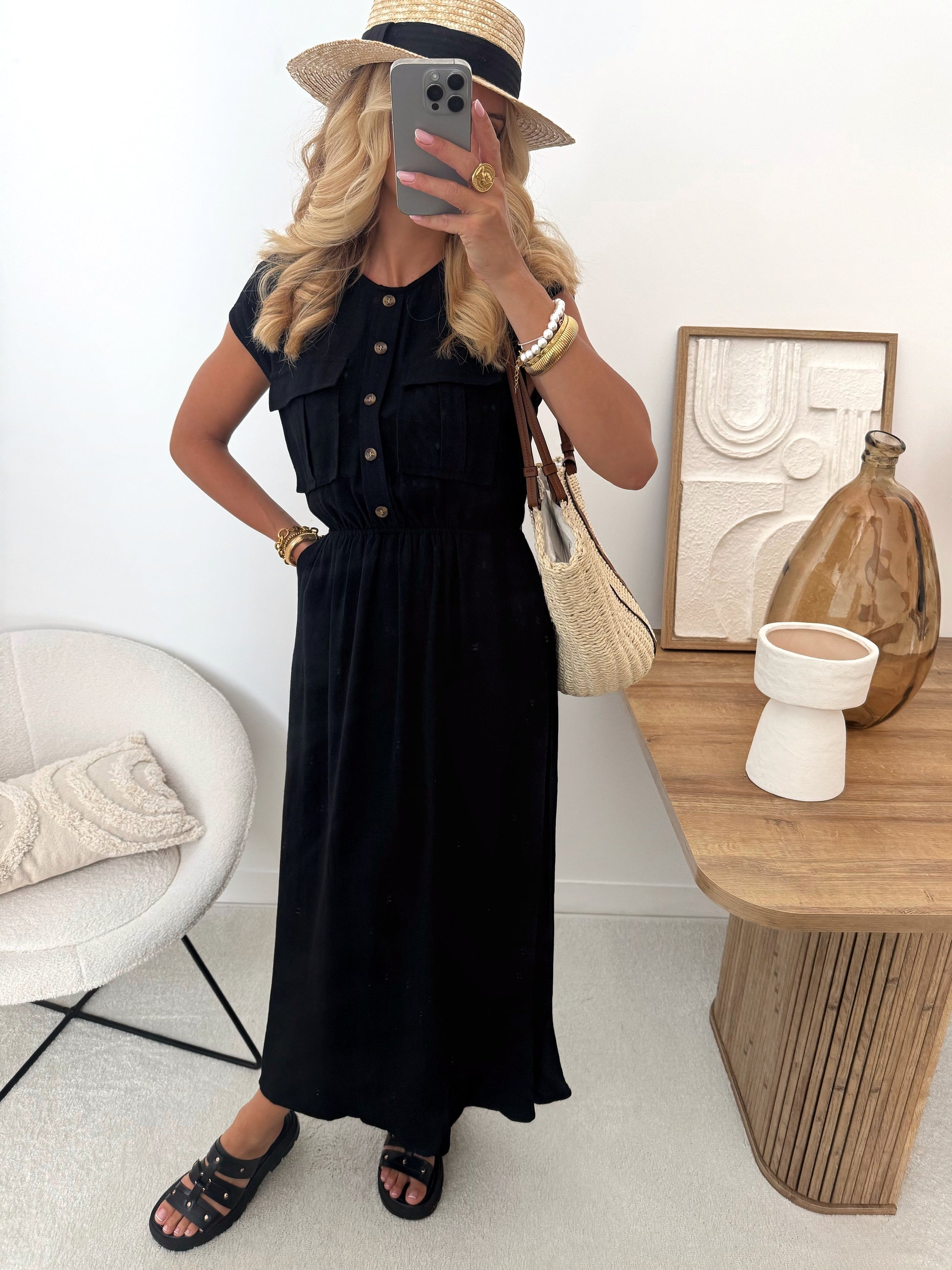 Elegante e casual, l'abito lungo PALAMAS punta sui dettagli: due tasche applicate con patta sul davanti, finta abbottonatura e apertura con bottoni sul retro. La cintura elasticizzata valorizza la figura, mentre il taglio dritto e le discrete tasche laterali uniscono comfort e praticità.