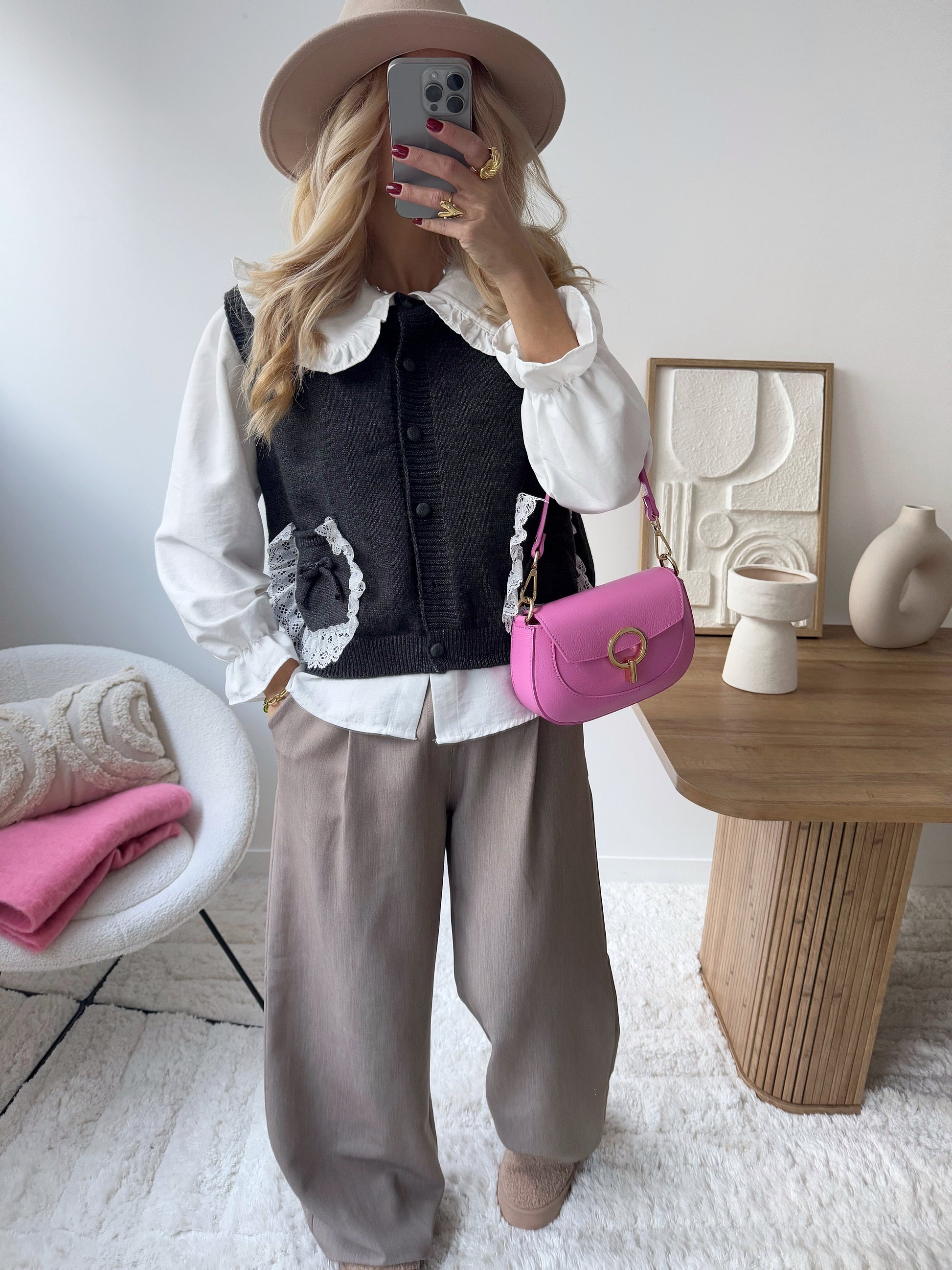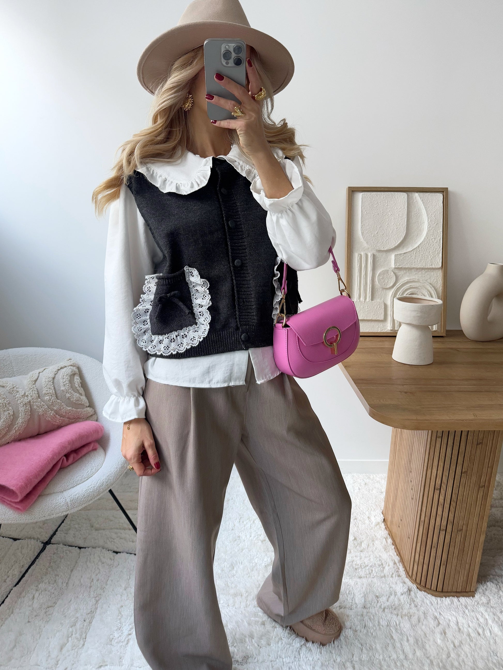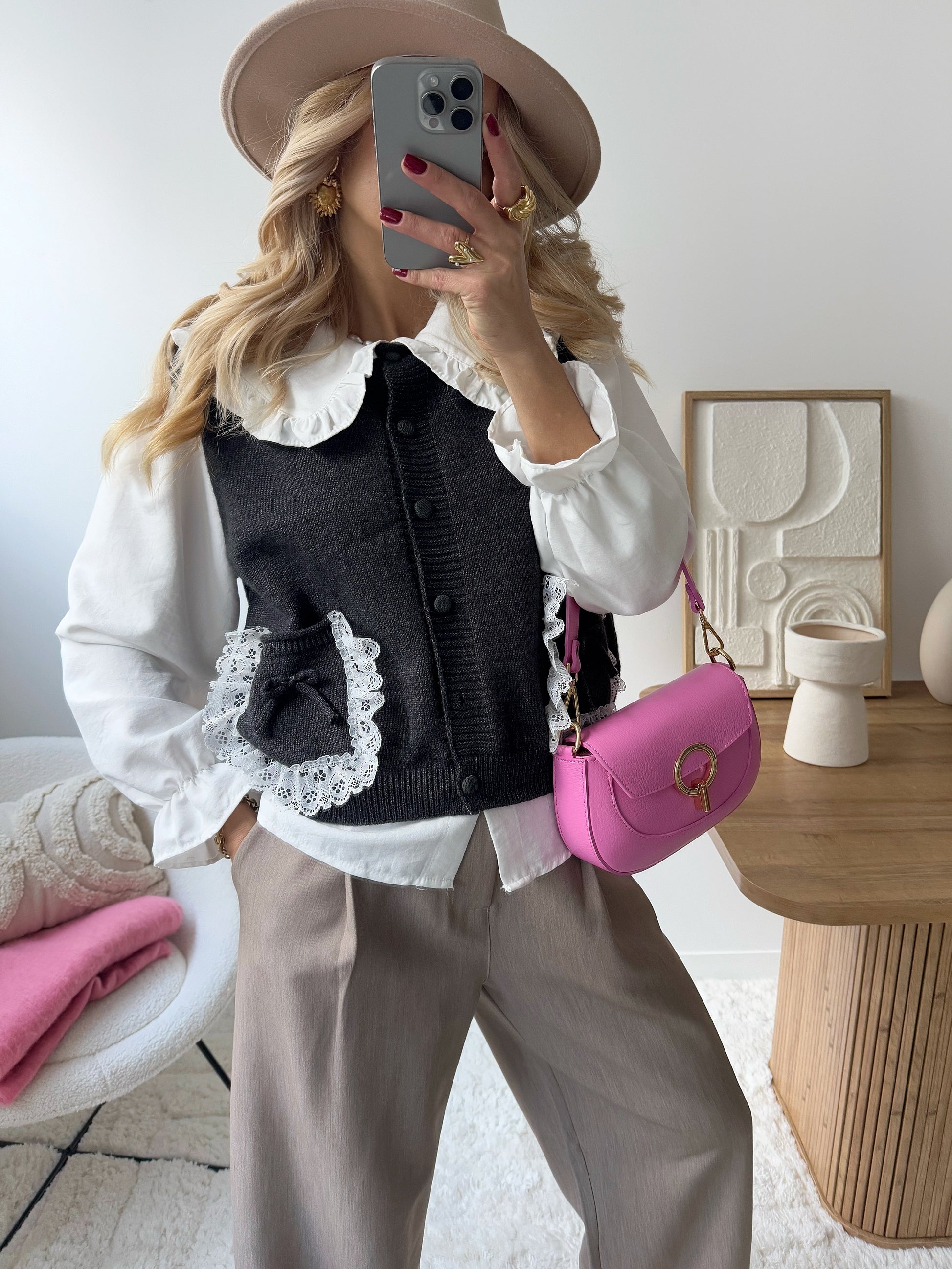 Combine elegance and comfort with the BETHEL dual-fabric knit sweater, a sophisticated piece for your wardrobe. The ruffled Peter Pan collar adds a delicate, feminine touch, while the ruffled elastic cuffs add a refined finish. The button placket allows for a practical and modern fit. The two patch pockets adorned with bows and lace add a lovely touch of style and texture, perfect for a chic yet classic look. Crafted from a soft and comfortable knit, this sweater is ideal for enhancing your casual outfits while remaining elegant.