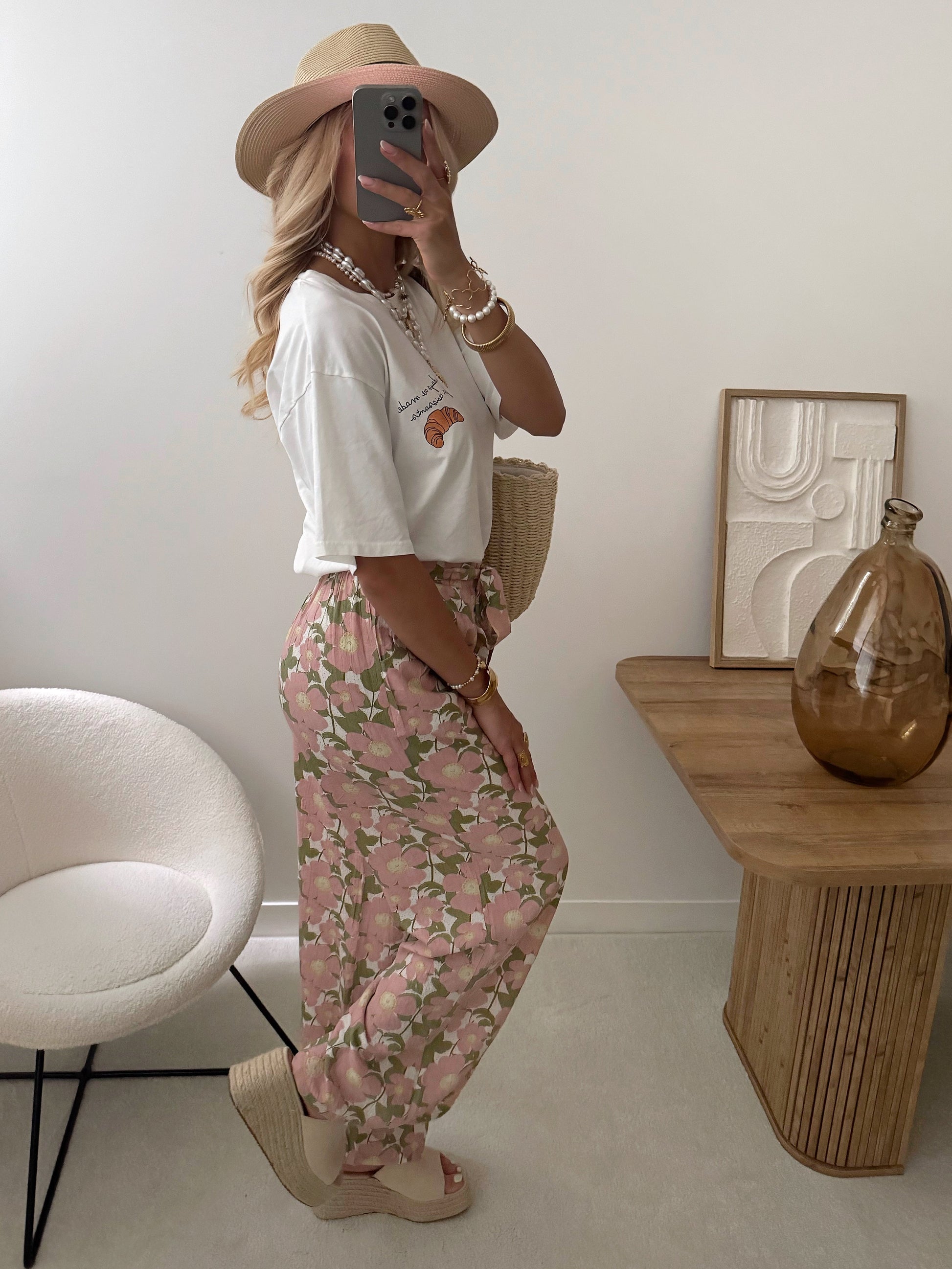 Our JULIO floral print pants embody the perfect balance of sophistication and comfort. Their loose, straight cut fluidly structures the silhouette, while the elasticated waistband delicately hugs the shape without restricting it. Crafted from a lightweight fabric with an impeccable drape, they feature two discreet side pockets, combining practicality and refinement. Ideal for creating a relaxed yet polished look, they pair harmoniously with a voile or cotton blouse for a graceful silhouette.