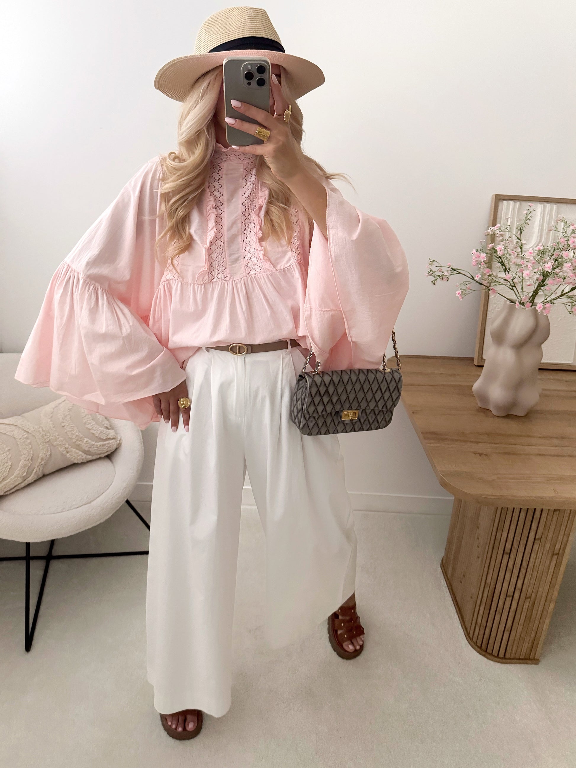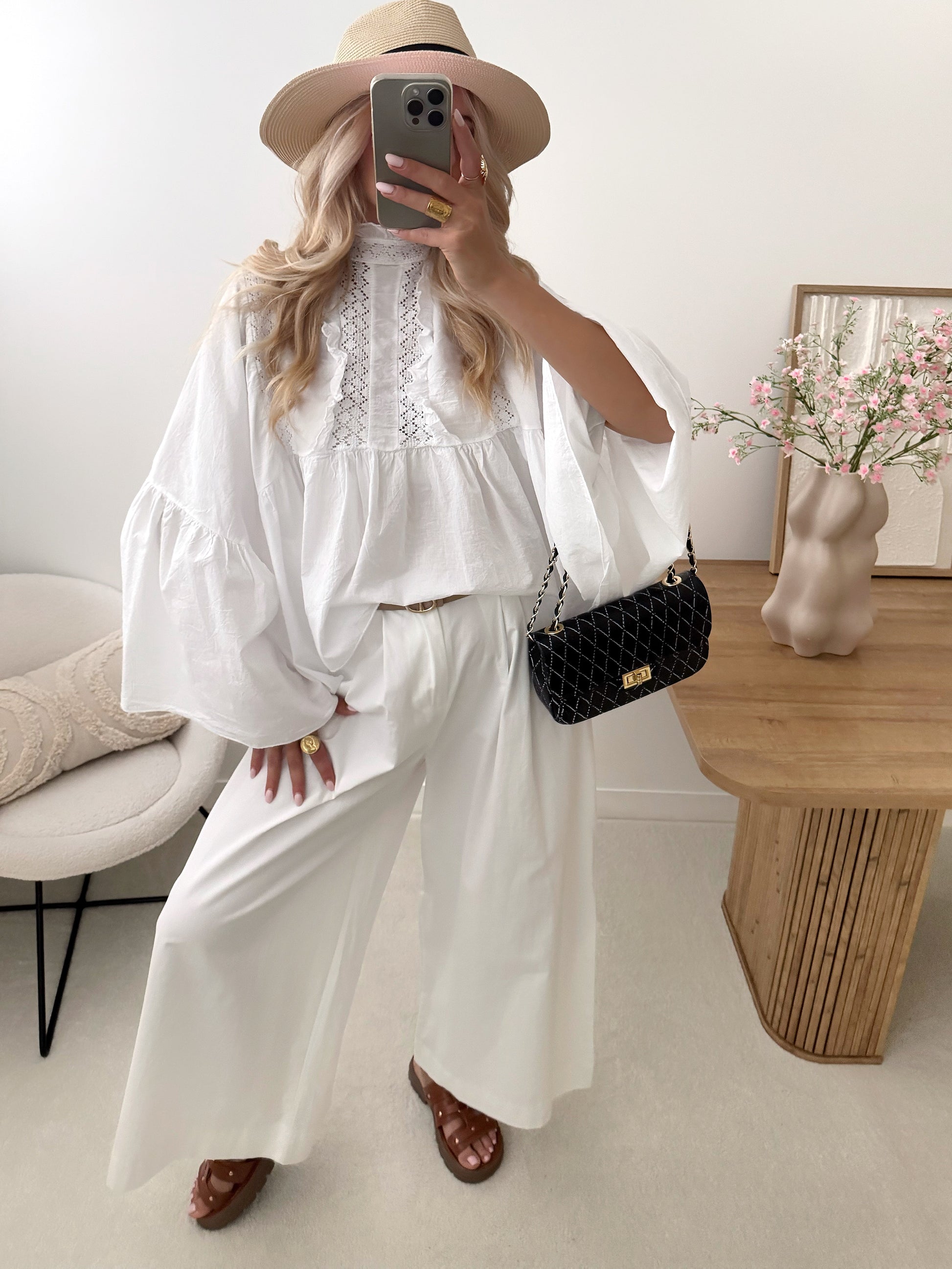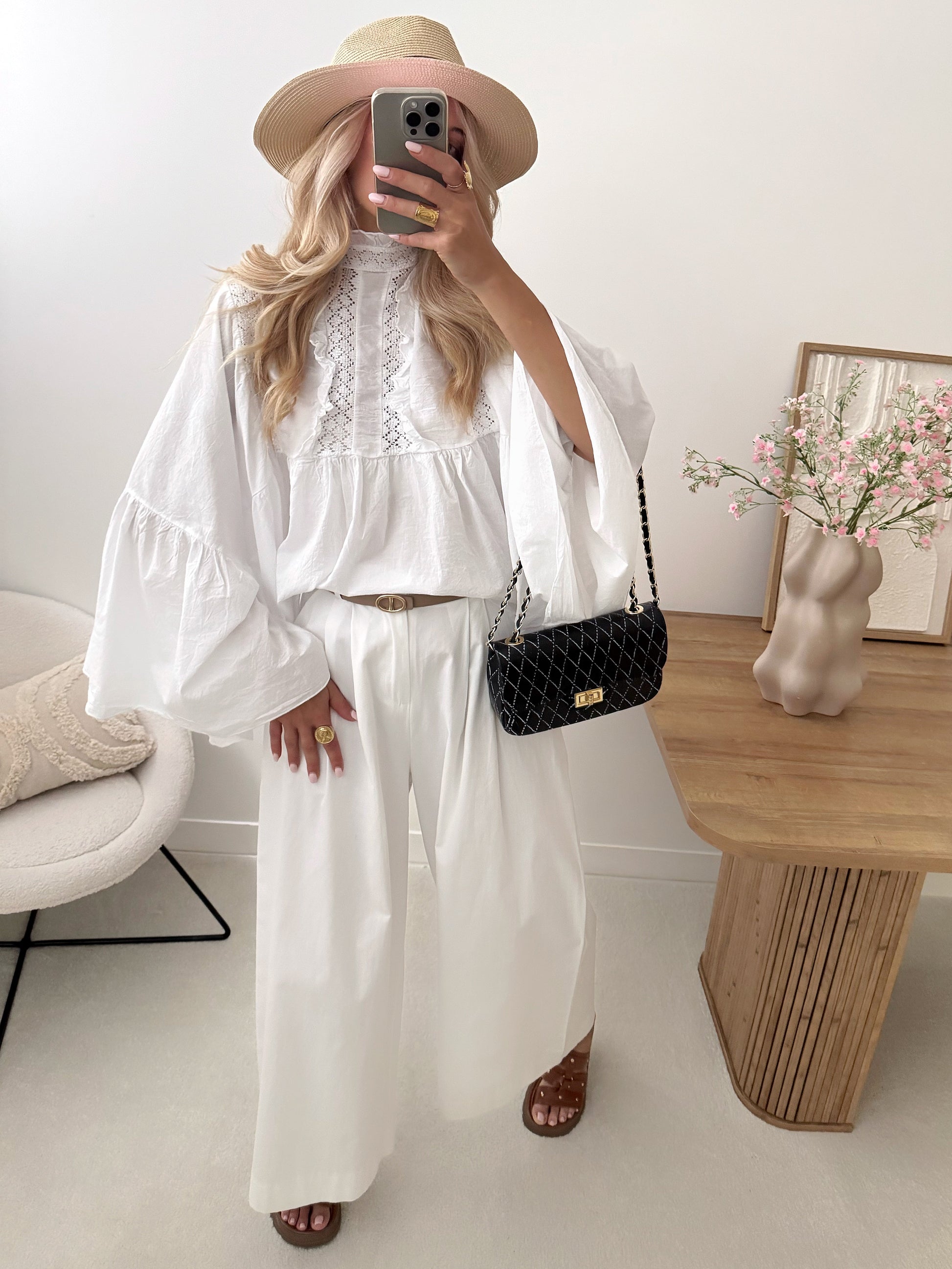 Combine structure and fluidity with these straight-cut, culotte-effect pants, designed to combine comfort and elegance for everyday wear. Featuring pleats on the front, they flatter the figure without restricting it, and offer a beautiful fit. The waistband is equipped with belt loops to slip in a belt as desired, while the elasticated back ensures a comfortable fit and optimal ease of movement. Practical without compromising style, these pants have Italian pockets on the sides, and two patch pockets on the back, for a casual chic touch. This style adapts to all desires: wear it with a tucked-in blouse for a soft office look, or with a fitted top and sandals for a more relaxed and contemporary look. It also lends itself to layering with a flowing blazer or a lightweight knit in between seasons. A must-have for the modern wardrobe, perfect for those who like to combine feminine allure, comfort, and a tailoring spirit effortlessly.