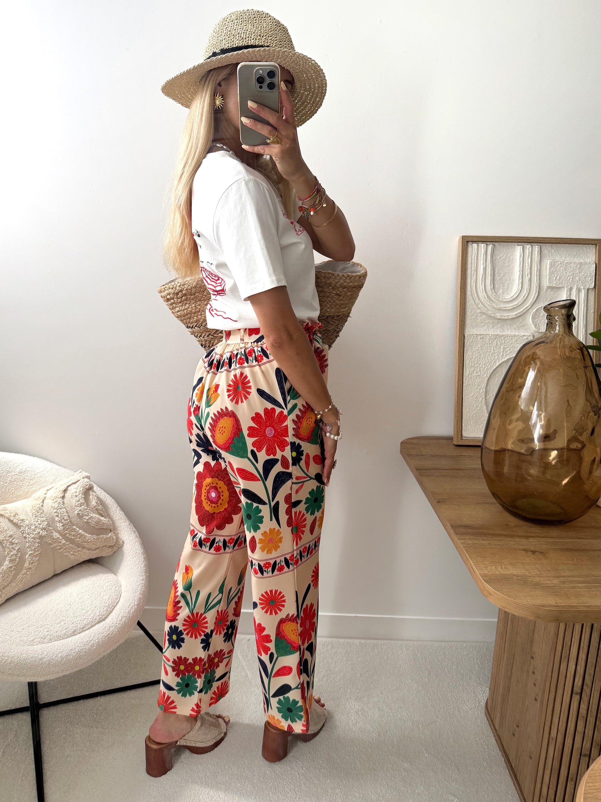 With their smocked back waist, tie belt, and side pockets, the ISNELLO floral pants combine comfort and style. The fitted cut and ruffle at the waist add a discreet feminine touch.