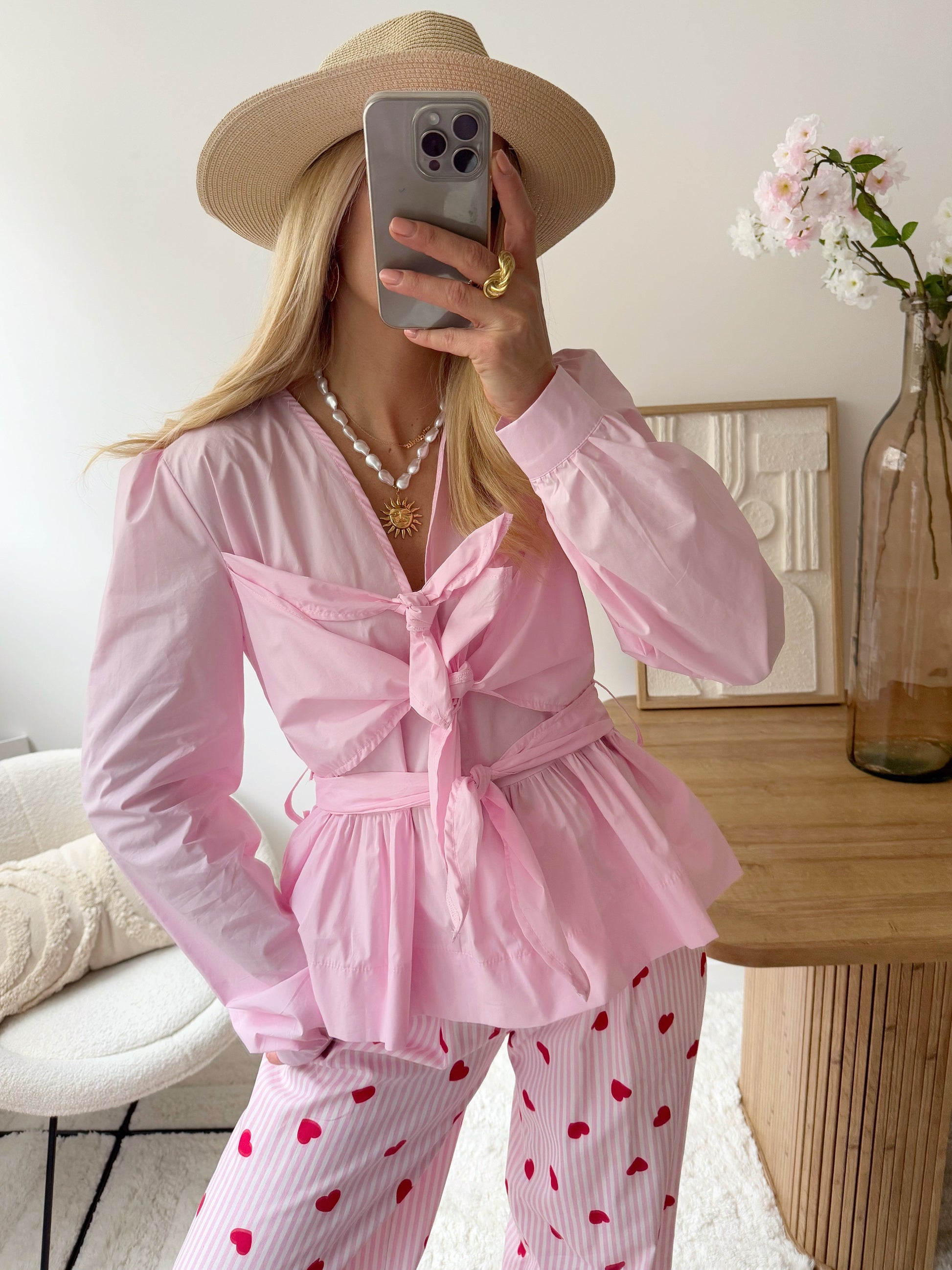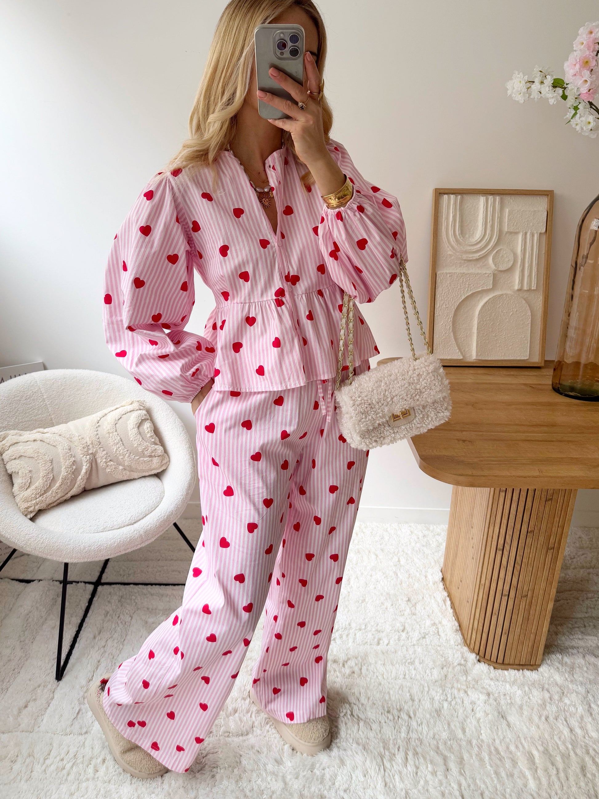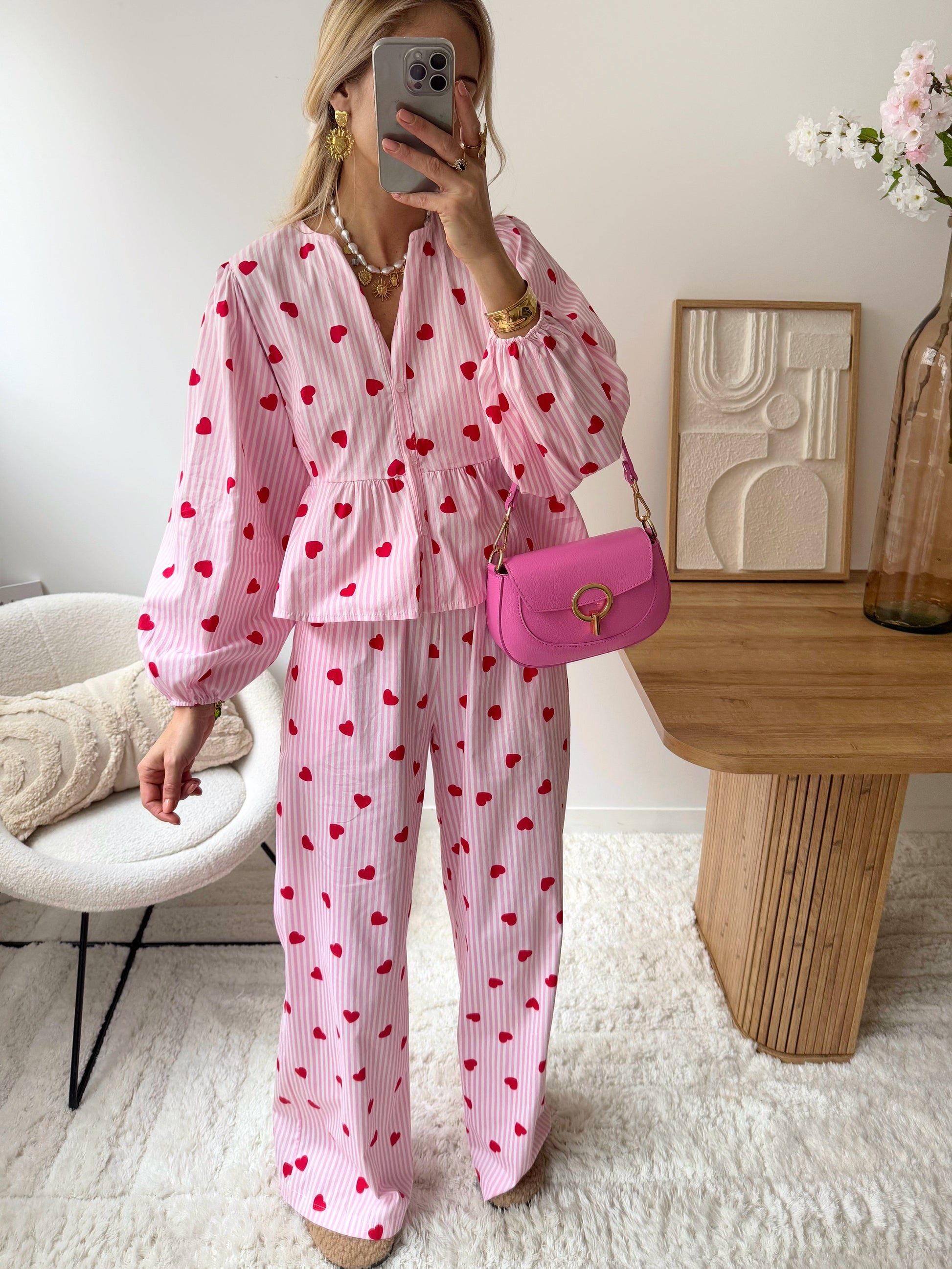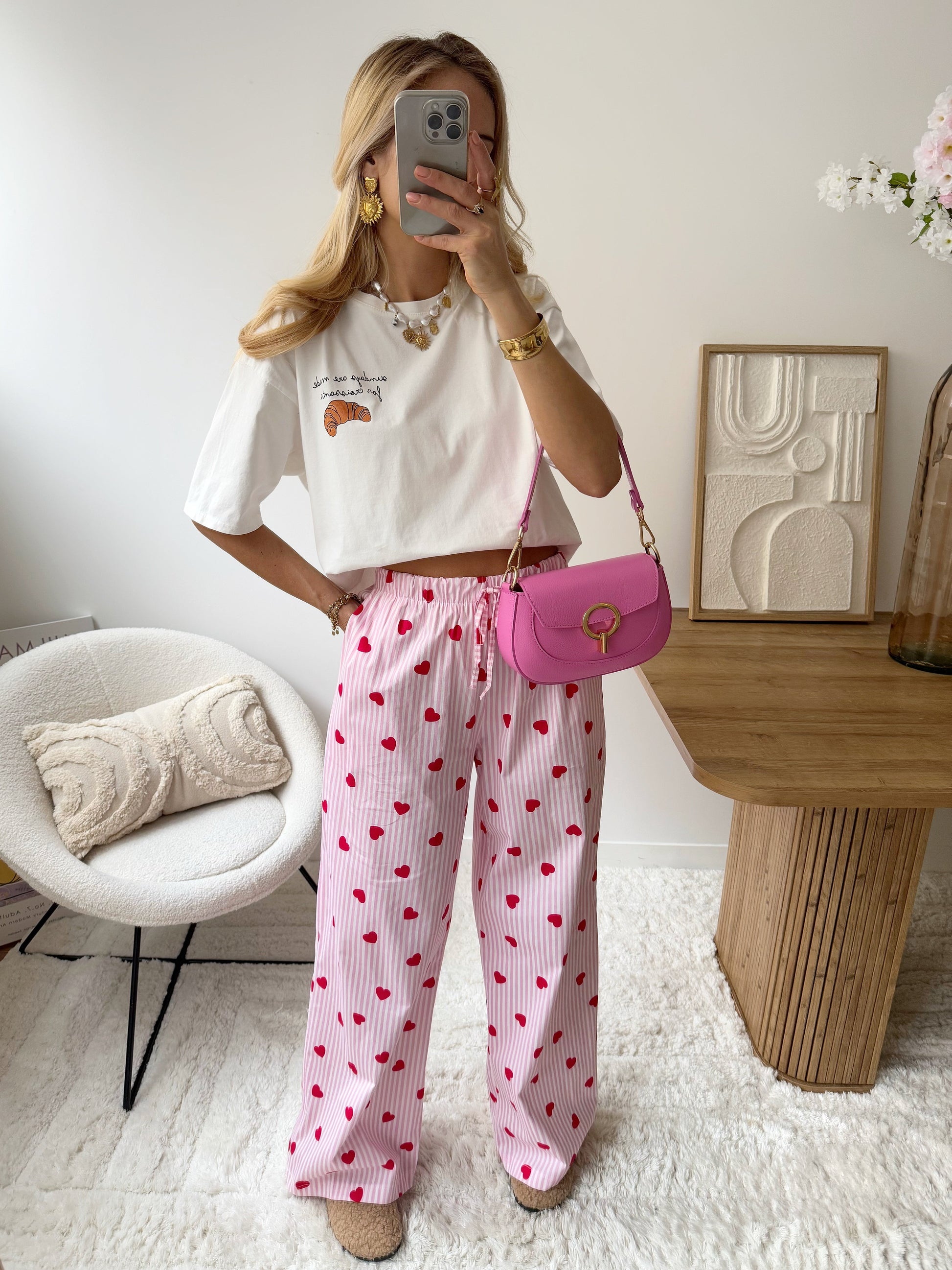 Our pants AMITI combines a straight, slightly wide cut with a pattern that is both modern and romantic. The vertical stripes add a touch of elegance and elongation to the silhouette, while the subtly distributed print of small hearts adds a playful and original note. These pants, with their fluid cut, offer both comfort and style, creating a perfect balance between sophistication and lightness. They can be worn with a blouse for an original outfit or with a top for a casual look. You can pair them with our NORMA blouse .