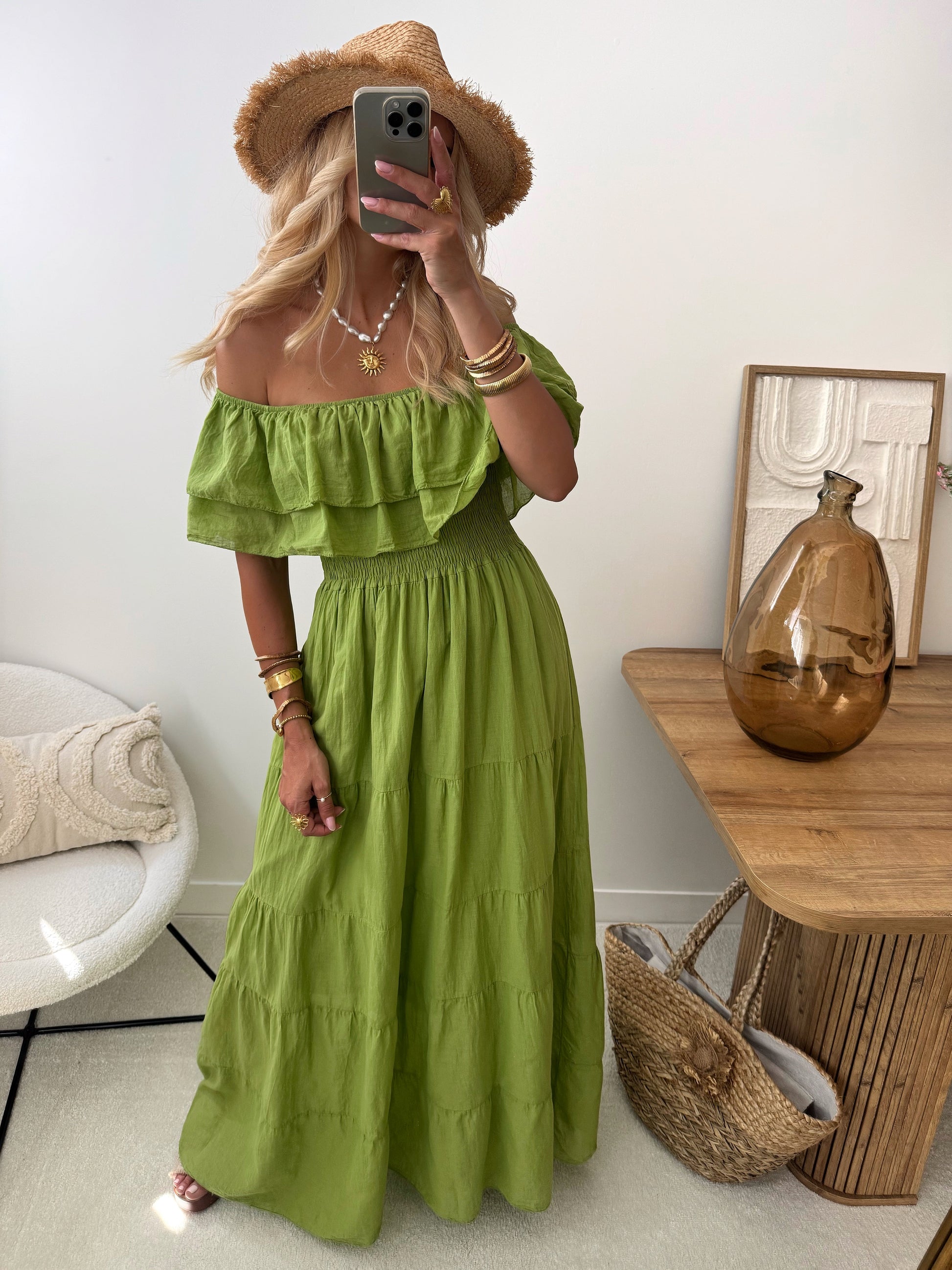 Lightweight and charming, the ARCANE maxi dress embodies the elegance of sunny days with its elasticated bardot neckline and romantic ruffles. The smocked bodice and elasticated waist ensure comfort and femininity. Its flowing, lined cut offers a perfect drape. Wear it day or night, for a bohemian or more sophisticated look.