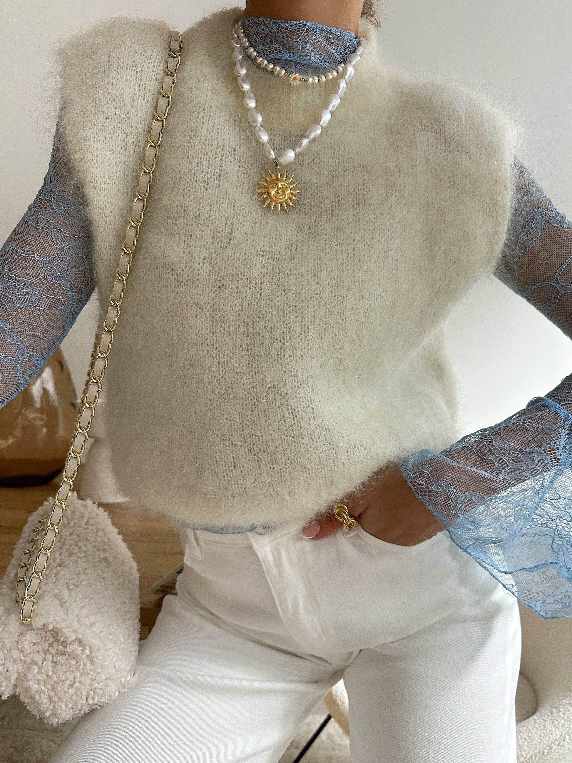 The sheer JORDYNE lace top combines lightness and elegance. Its long sleeves and ruffled cuffs add a touch of femininity, while the slightly high neck adds a refined detail. The fine, airy lace creates a delicate, flowing silhouette, ideal for a look that's both chic and comfortable. Perfect for evening or daytime wear, this top pairs easily with a variety of pieces for an elegant, timeless style.